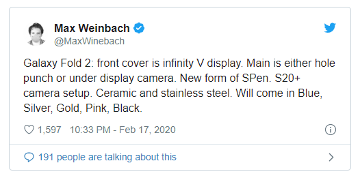 갤럭시 폴드 1세대는 갤럭시 S10 플러스를 따랐던 것처럼, 갤럭시 폴드 2세대는 갤럭시 S20 플러스의 카메라 구성을 따를 가능성이 큽니다. 이 내용은 xda-developers의 Max Weinbach가 트위터에서 언급한 내용으로 알 수 있습니다.