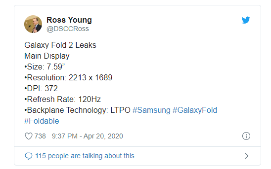디스플레이 컨설턴트 Ross Young은 4월 말에 화면 크기, 해상도, 기타 스펙에 대한 리스트를 트위터에 올렸습니다. 알려진 내용은 아래와 같습니다. (XDA Developers, SamMobile, ET News 등의 루머 포함)