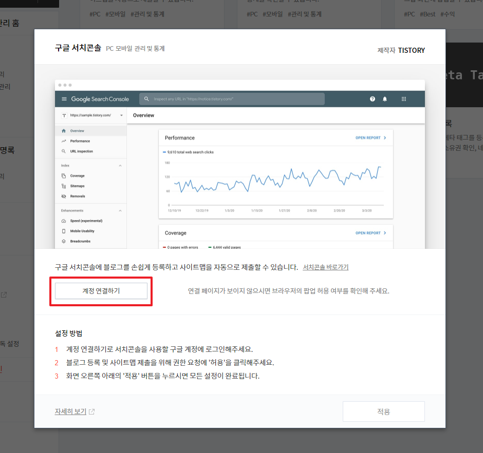 2. '구글 서치콘솔' 대화상자에서 '계정 연결하기' 클릭