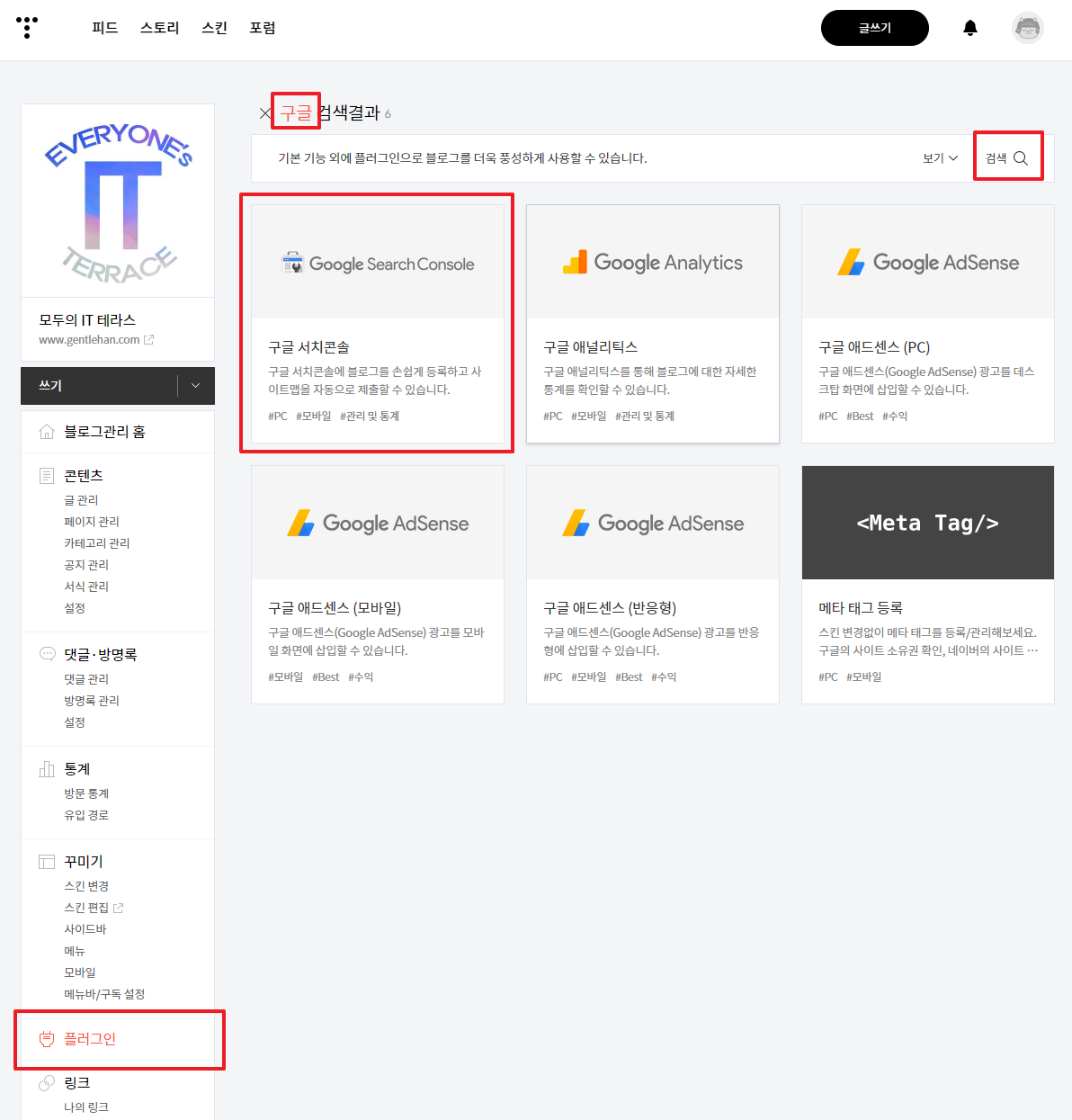 1. 티스토리 블로그 관리자 페이지의 '플러그인' 메뉴에서 '구글 서치콘솔' 검색