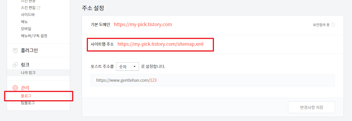 참고로, 구글 서치콘솔에 제출된 내 사이트맵 주소는 블로그 관리자 페이지의 '관리' - '블로그' - '주소 설정'에서 확인할 수 있어요.
