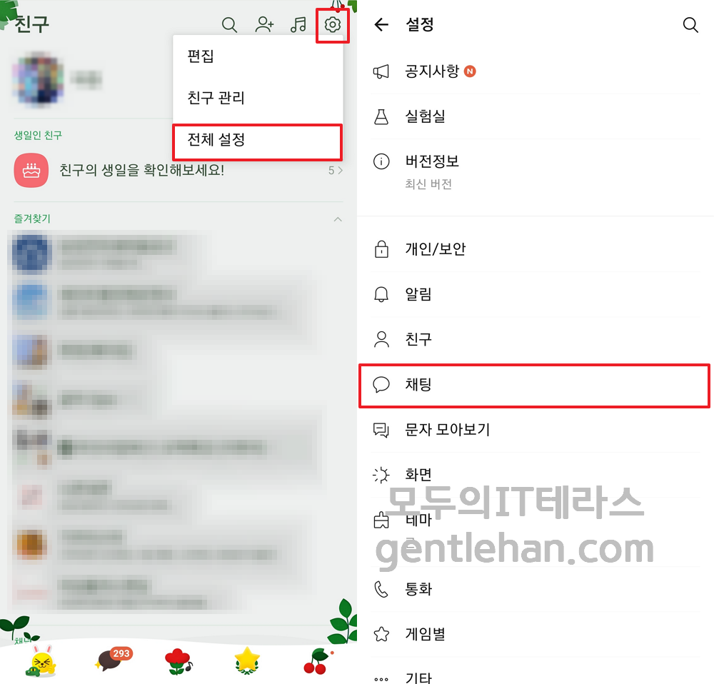1. 카카오톡 우측 상단 '설정' → '전체 설정' → '채팅' 메뉴로 들어가세요.