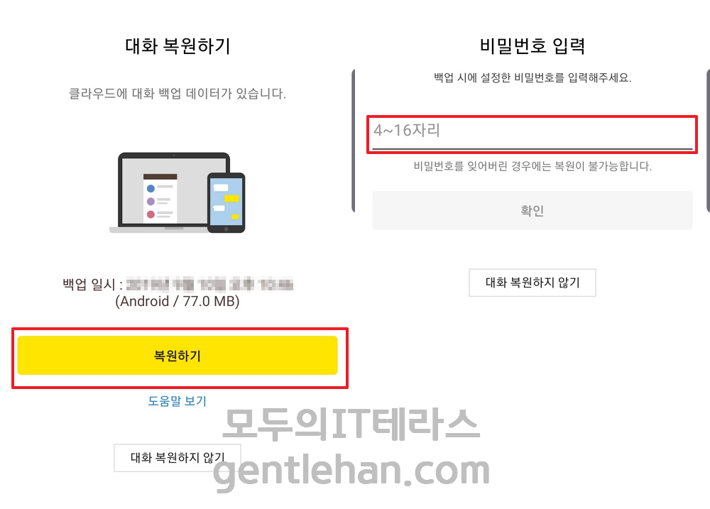 2. 인증을 마치자마자, 대화내용 복원 창이 나타나면, 백업할 때 사용했던 비밀번호를 다시 넣고 복원!