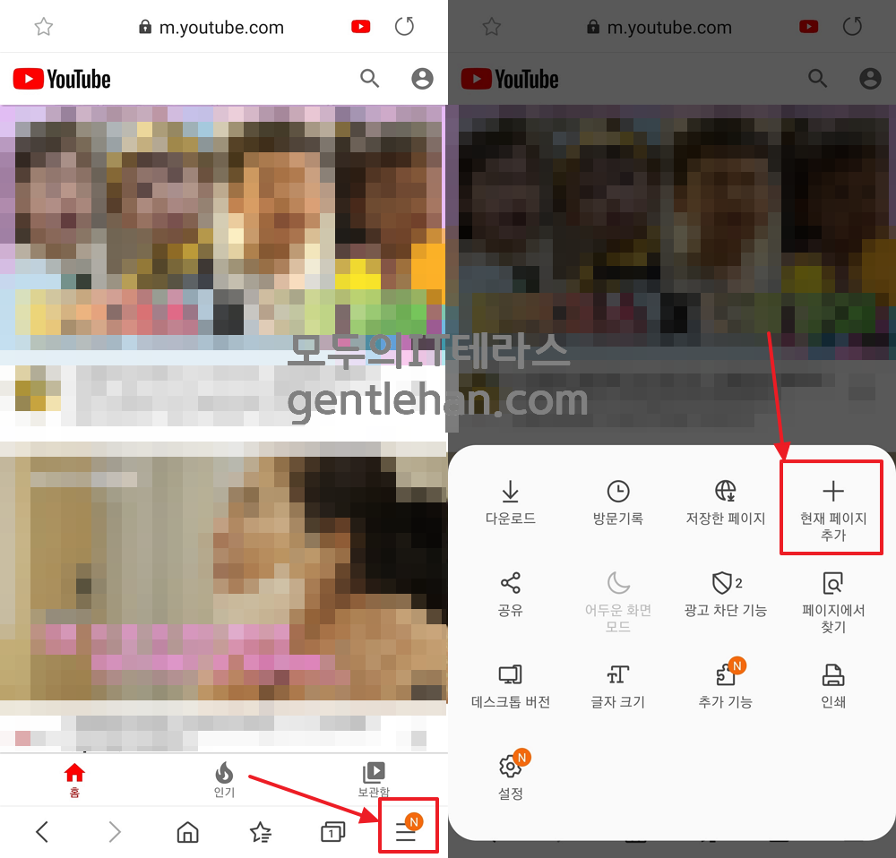 단, 이 방법은 유튜브앱이 아닌 '삼성 인터넷 브라우저' 앱에서만 작동하는 방법이기 때문에 유튜브 시청 시, 삼성 인터넷 브라우저에서 유튜브( www.youtube.com 혹은 m.youtube.com) 검색으로 페이지를 열어야합니다. 하지만, 홈화면에서 바로가기 아이콘을 활용하는 방법이 있으니 아래를 참고해 주세요~!