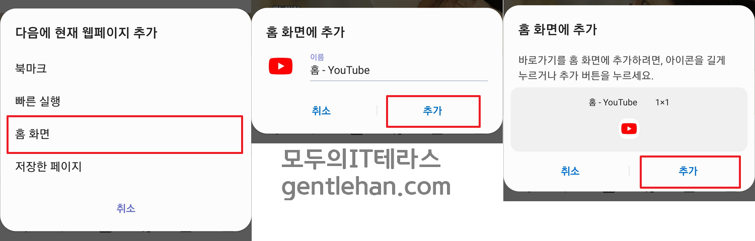 아래 이미지와 같이, 삼성 인터넷 브라우저 앱에서 유튜브(www.youtube.com 혹은 m.youtube.com) 접속 후, 최하단 '더보기' 메뉴 → '현재 페이지 추가' 선택 → '홈 화면' 선택 → '바로가기 추가' 순서로 진행하면 끝!