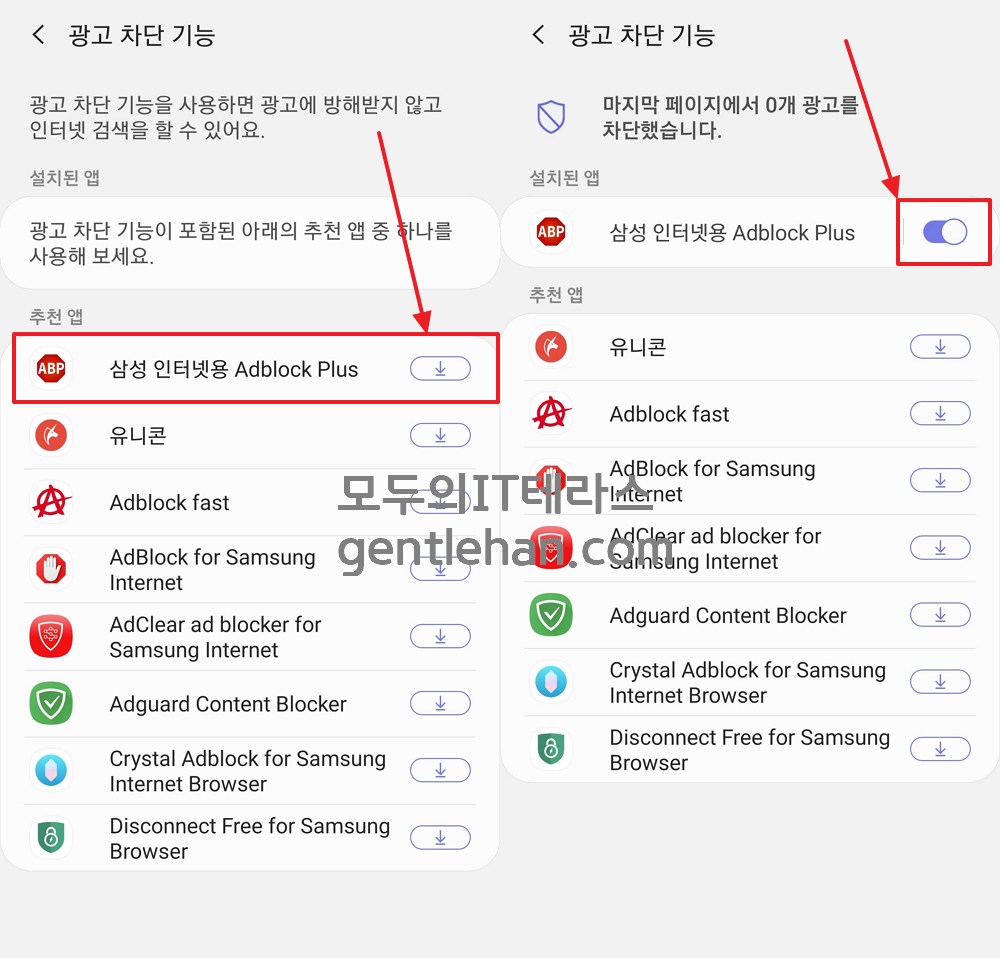 '삼성 인터넷용 Adblock Plus' 외의 다른 앱들은 유료이거나, 사용 방식이 조금 어려울 수 있기 때문에 삼성 인터넷 브라우저 용도로 만들어진 '삼성 인터넷용 Adblock Plus'를 설치하는 게 좋습니다.
