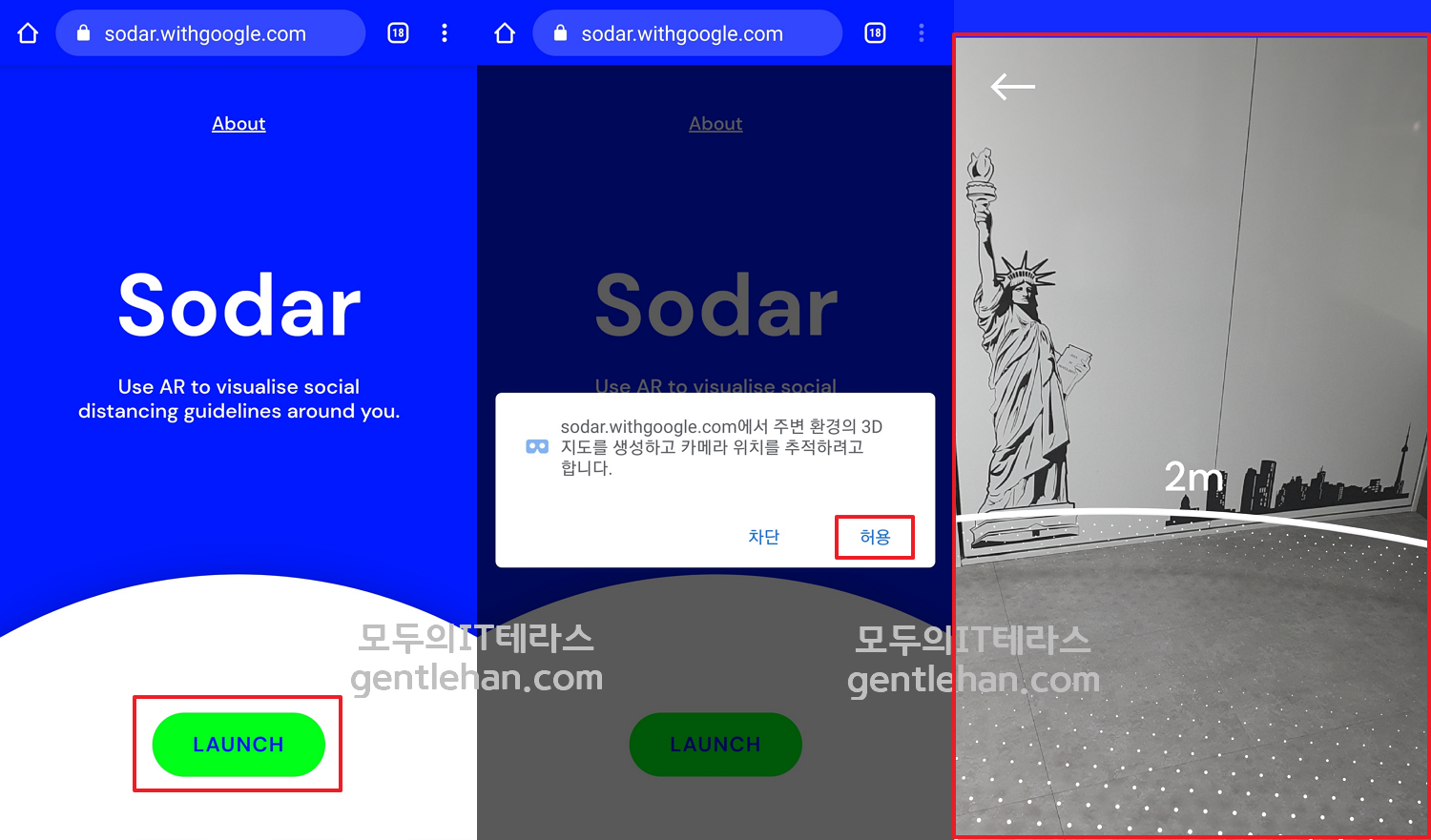 구글 SODAR는 증강현실을 활용하여 휴대폰을 통해 약 2미터의 거리를 경계선으로 스마트폰 화면에 보여줍니다. 코로나 바이러스의 확산을 방지하려면 자신과 대화중인 사람이 이 경계선을 벗어나 있는지 확인해야합니다.