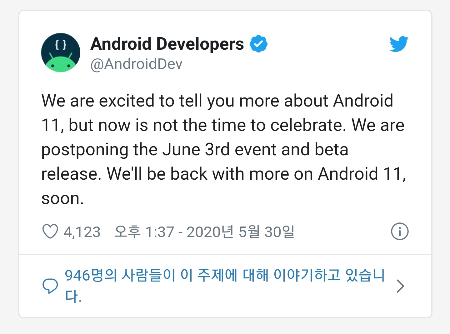 하지만 트위터 공식 안드로이드 개발자 계정에 따르면, 라이브스트림이 연기되면서 안드로이드 11에 대한 모든 것을 알아내기 위한 기다림은 무한정 연기될 것이라고 합니다.