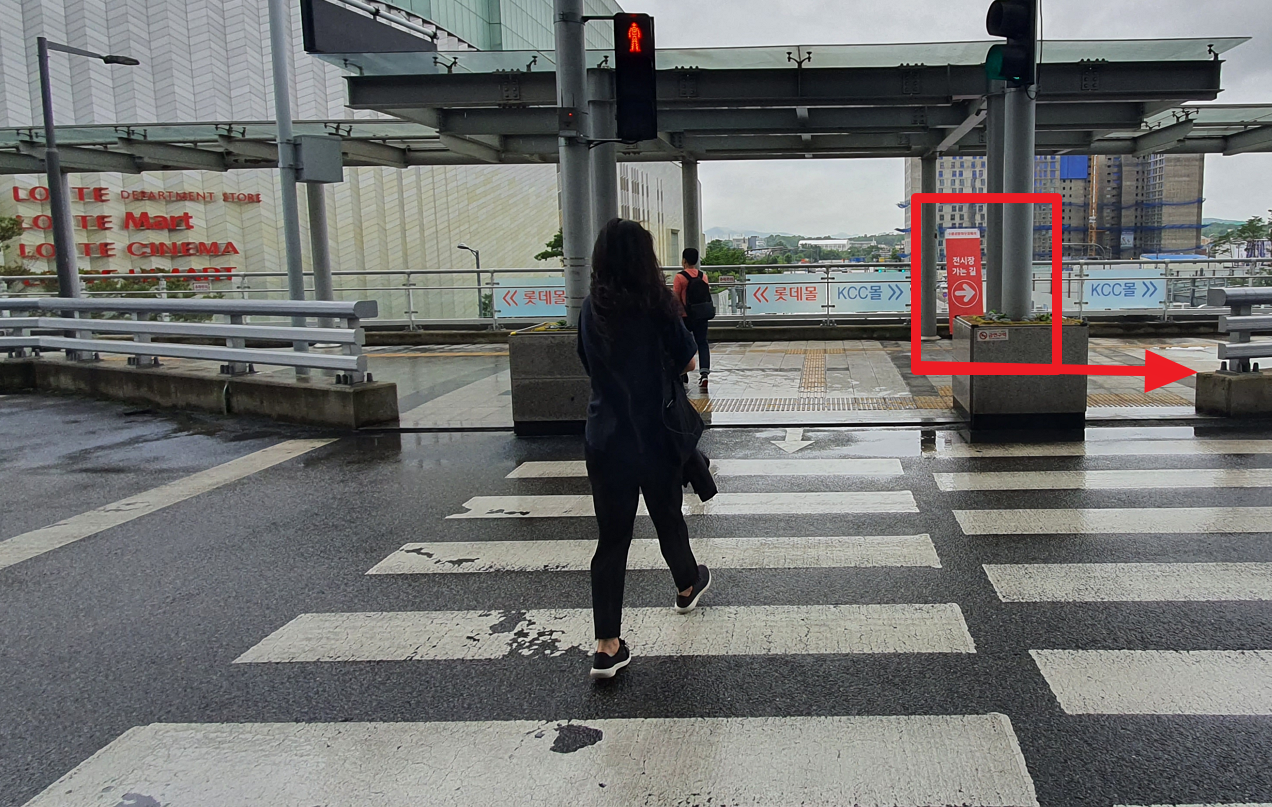 끝까지 직진한 후, 오른쪽 KCC몰 방향으로 갑니다. 행사에 따라 [전시장 가는길] 배너가 있을 수 있습니다.