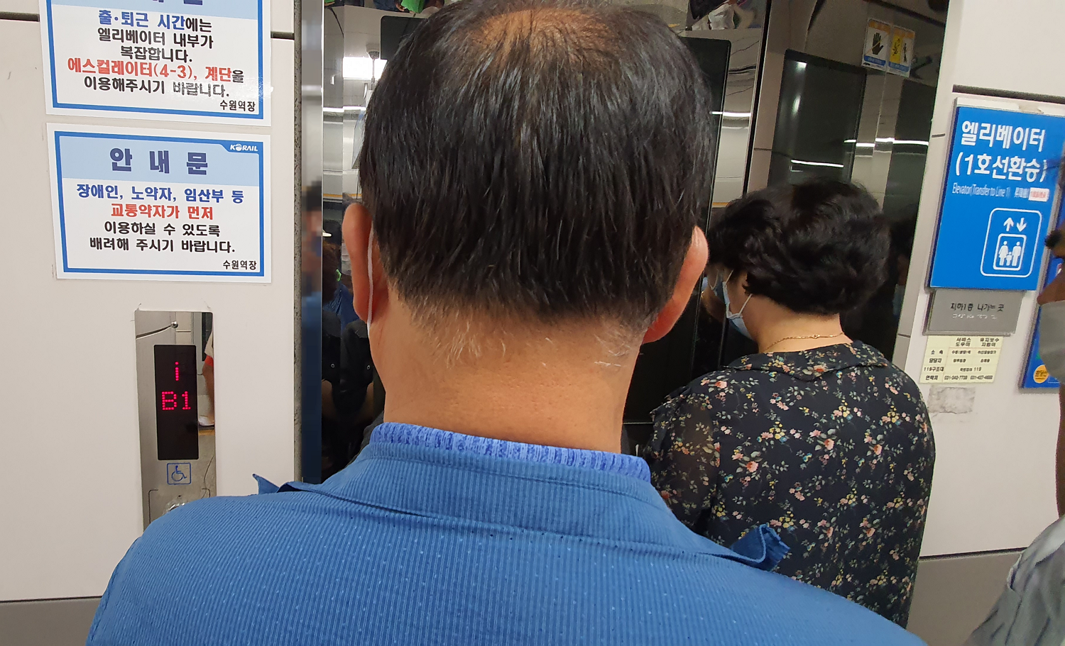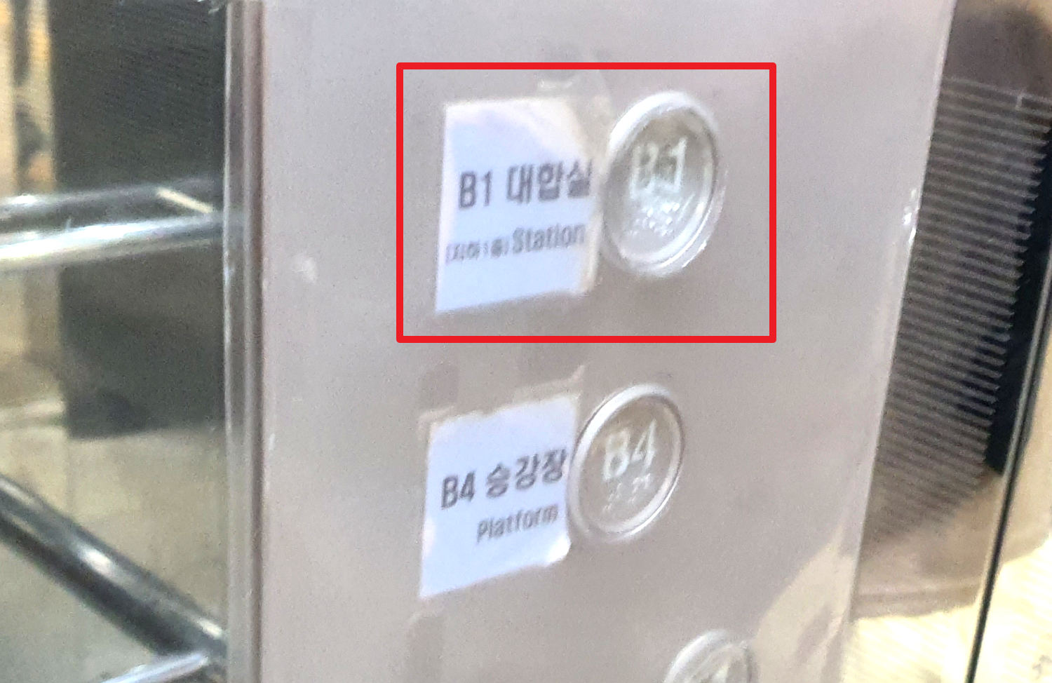 제일 빨리 뛰어나갔지만, 안타깝게도 다른 객차에서 더 먼저 뛰어나온 사람들로 인해 순서가 밀렸지만 그래도 이정도면 선빵한 것 같습니다. 이 엘리베이터는 최대 10명 정도 탑승이 가능한 정도의 공간이기 때문에 혹시라도 5번째 줄까지 밀려서 줄을 설 경우 다음번 엘리베이터를 타야하는데 지하 4층→지하 1층까지 무려 4개층을 한번에 왕복하는 엘리베이터이기 때문에 그만큼 시간이 더욱 걸리게 되어 밀리지 않기 위해서는 빠르게 뛰어가서 줄을 서는 것이 가장 좋습니다.