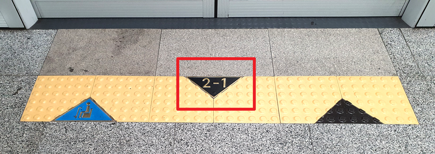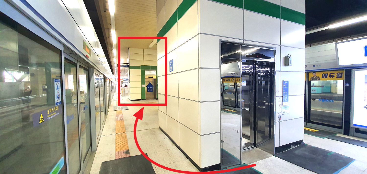 위의 사진은 다른 역의 사진이지만, 수원역에 도착하면 빨간 색 네모칸 위치에 엘리베이터 문이 있습니다. 객차 내부에서 2-1번 출입문에 찰싹 가까이 붙어 있다가 문이 열리자마자 엘리베이터로 무조건 뛰어가야합니다. 왜냐하면 이 엘리베이터를 이용하여 지상으로 올라가려는 수많은 경쟁자들이 있기 때문에(그렇지 않으면 헬루트로 에스컬레이터 여행을 해야 함) 바로 뛰어가서 줄을 섭니다.