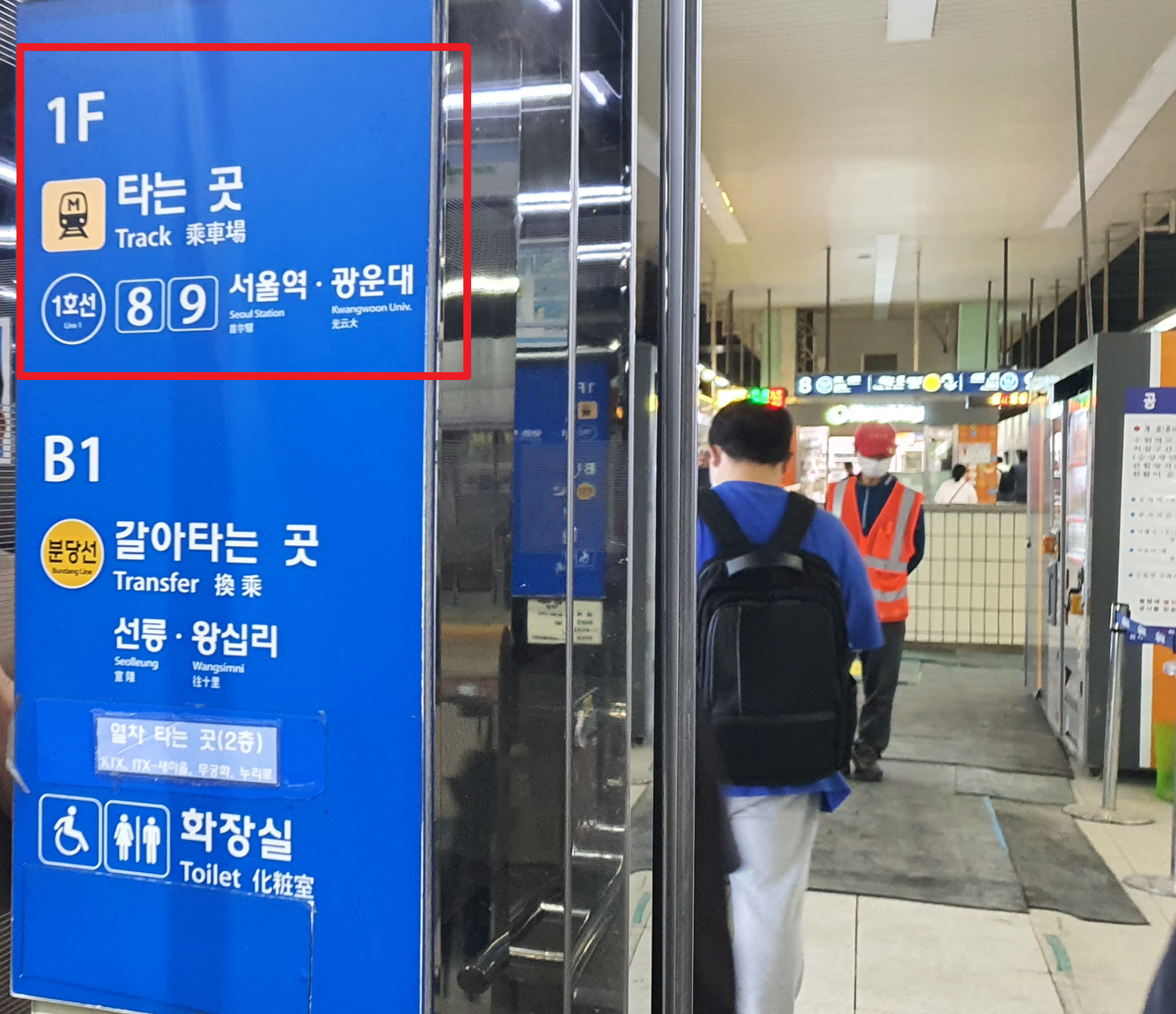 열심히 엘리베이터를 타고 1층으로 올라갔다면 이제 1호선 서울 방향 사람들의 미션은 여기서 끝입니다. 이제 남은 사람은 수원역 기차 대합실로 가야하는 사람들!