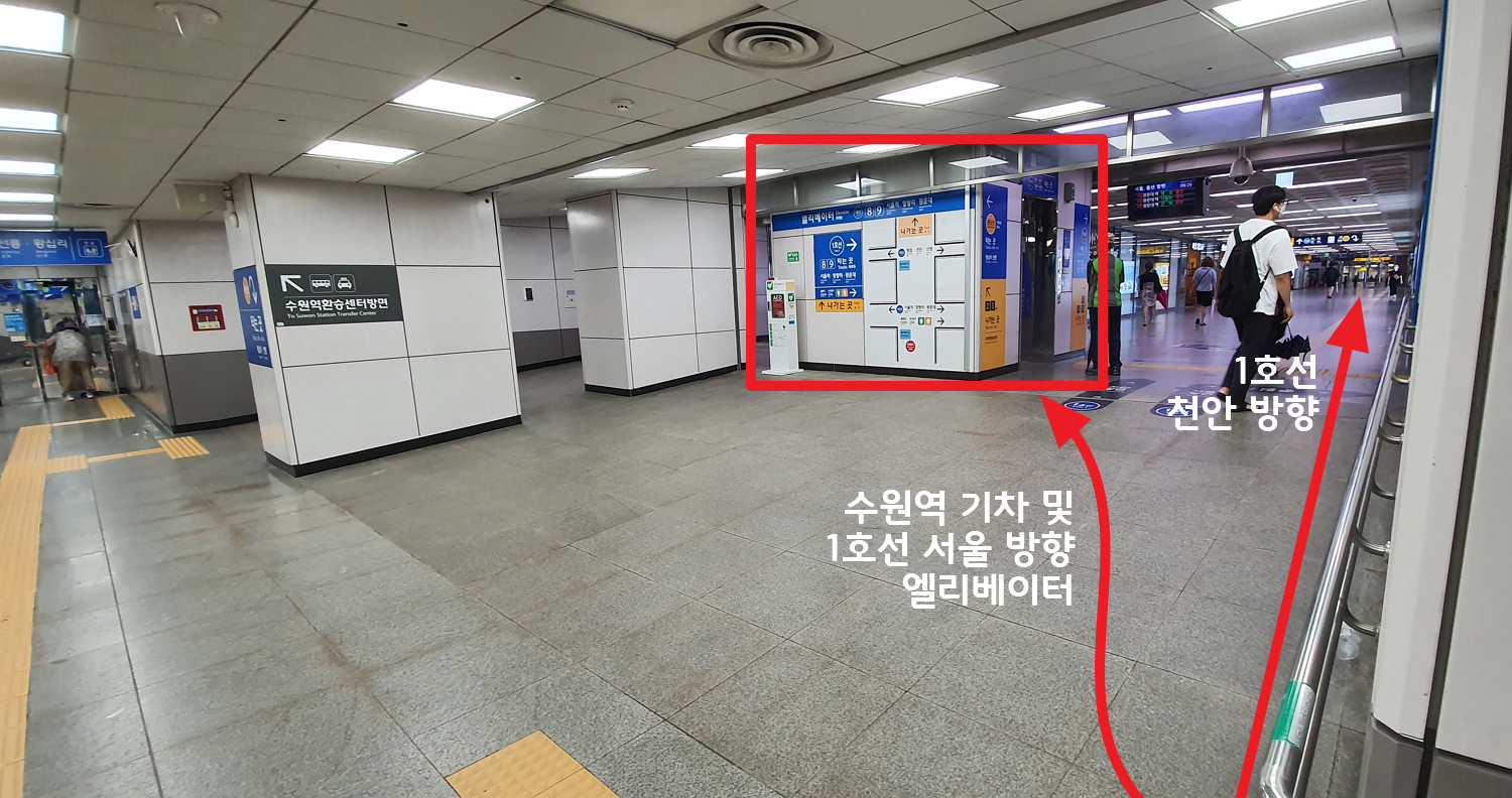 지하 1층에서 엘리베이터를 내렸다면, 기차역을 가는 사람과 1호선을 탈 사람의 방향이 나뉩니다. 아래의 사진처럼 엘리베이터에서 나오자 마자 오른쪽으로 돈 다음, 2층 기차 대합실과 1호선 서울 방향을 갈 경우, 앞에 보이는 엘리베이터를 다시 탑승하고, 1호선 천안 방향으로 갈 경우에는 직진해서 바로 위로 올라갑니다.
