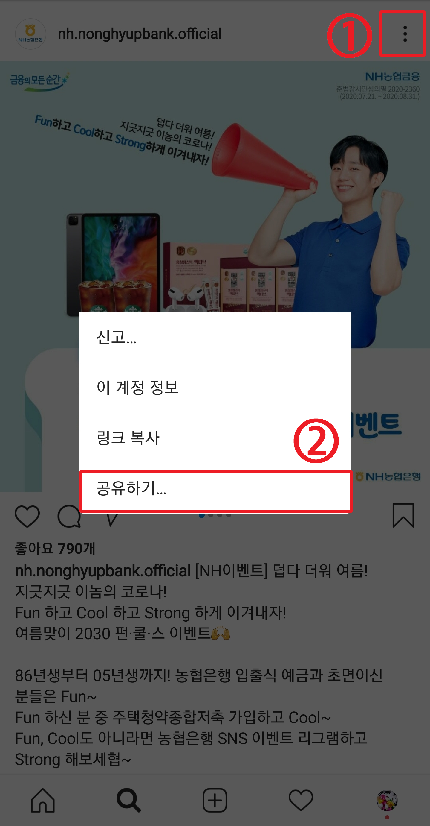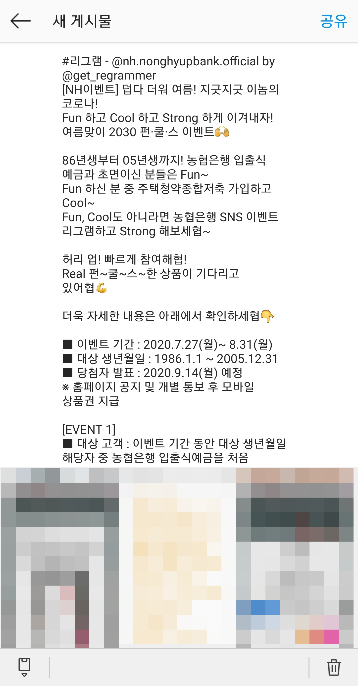원본 게시물의 본문까지 붙여지면, [공유] 버튼을 눌러서 피드에 올립니다. 그럼 리스램용 워터마크와 함께 내 피드에 원본 게시물이 리그램된 것을 볼 수 있습니다.