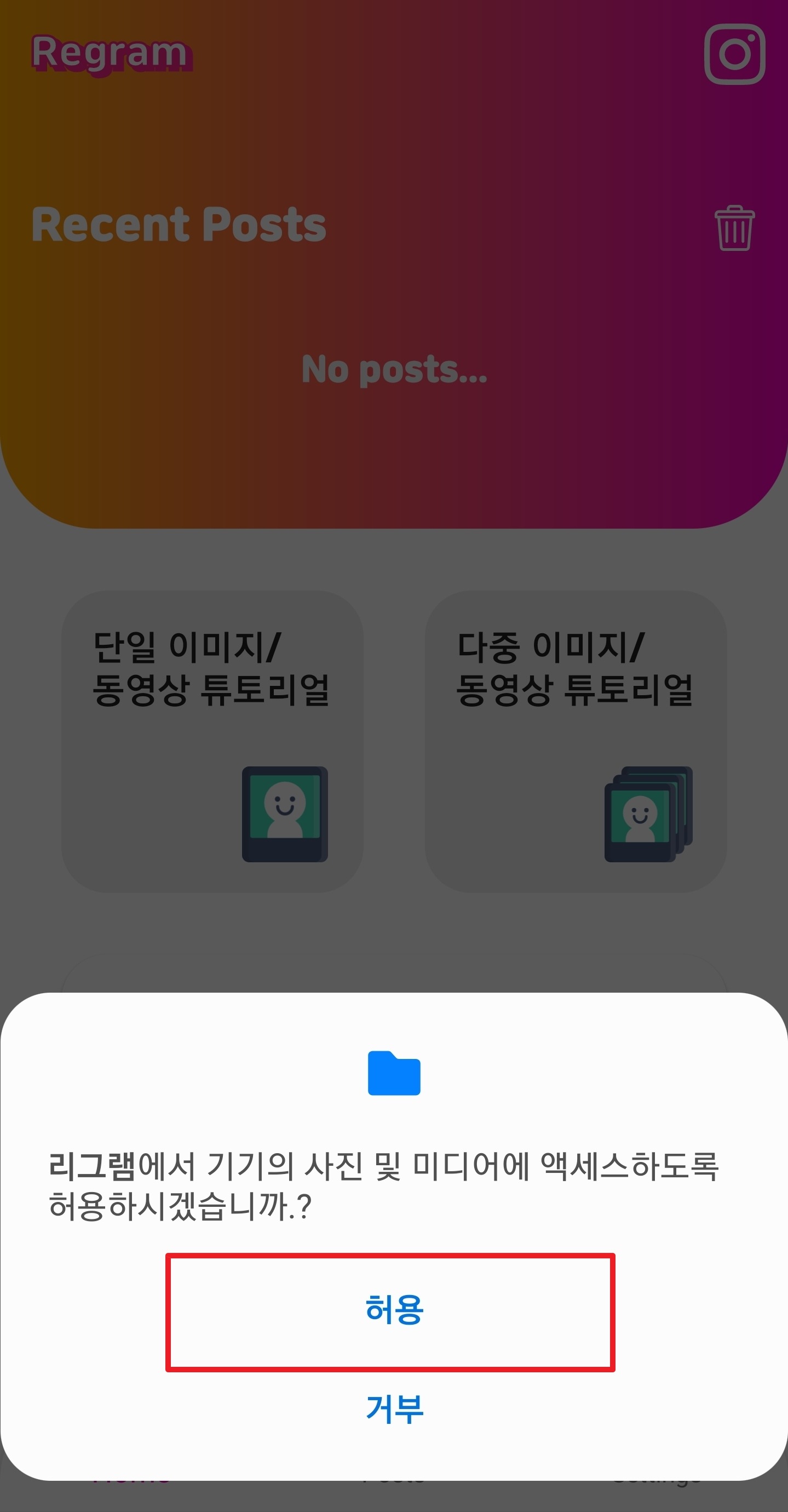 리그램 검색 후에, 리그램 앱을 설치해준 후 실행을 하면 미디어 액세스 허용 여부가 뜹니다. 클립보드와 갤러리에 리그램할 사진과 본문 컨텐츠들을 잠깐 저장했다가 불러오는 프로세스라서 이 부분은 허용으로 넘겨주면 됩니다.