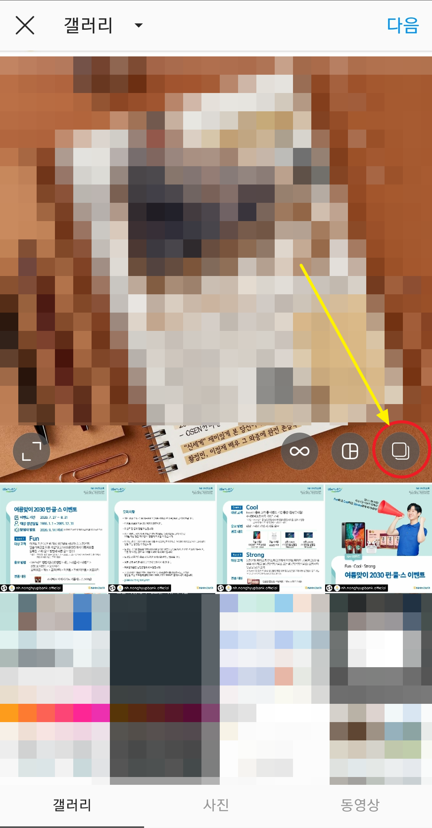 인스타그램이 열리면, 맨 밑에 있는 [+] 버튼을 눌러서 피드를 올릴 사진들을 찾아줍니다. 여러장을 올릴 것이기 때문에 [여러장 올리기] 옵션을 선택하고, 사진을 선택해줍니다.