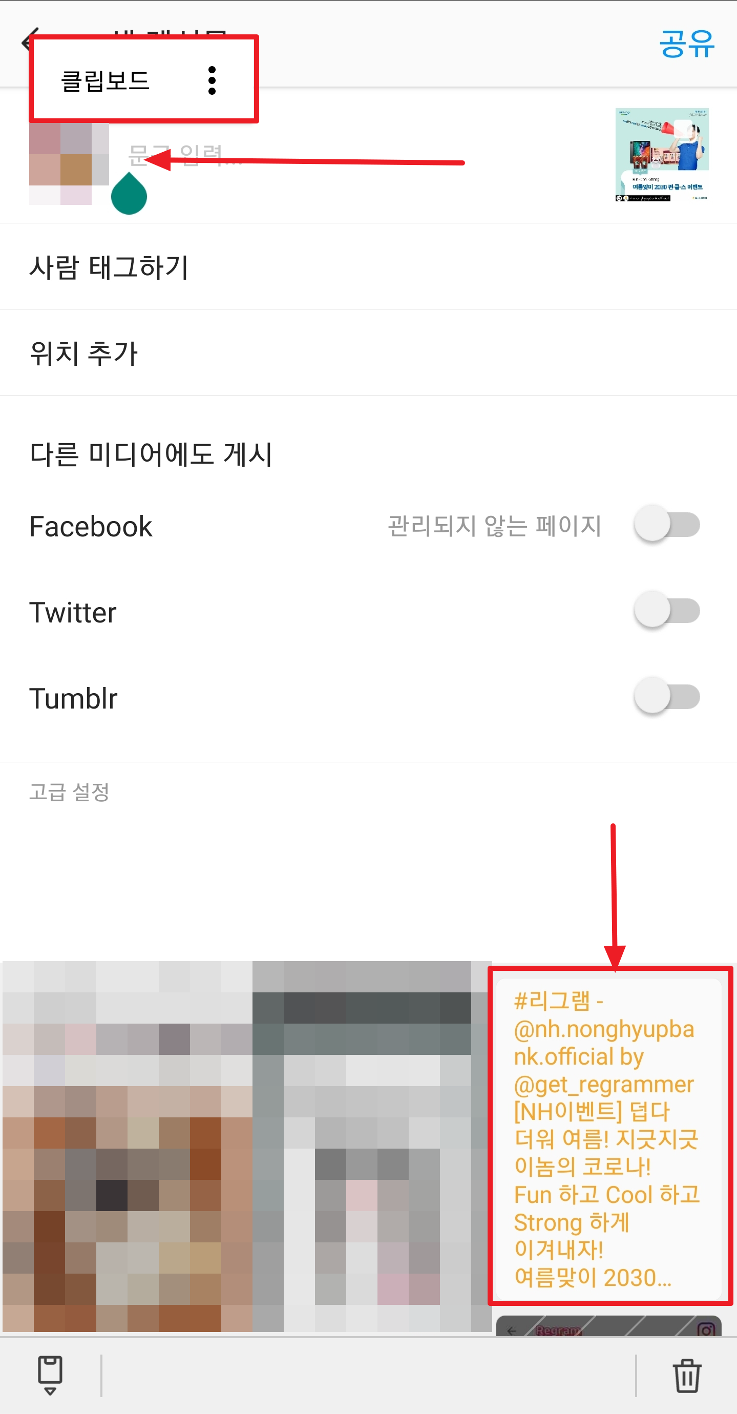 사진 선택이 다 끝나면, 이제 본문을 작성해야 하는데 리그램은 원본 게시물의 본문을 그대로 가져다 쓰는 것이므로 클립보드에 저장되어 있는 원본 게시글 내용을 가져오면 됩니다.