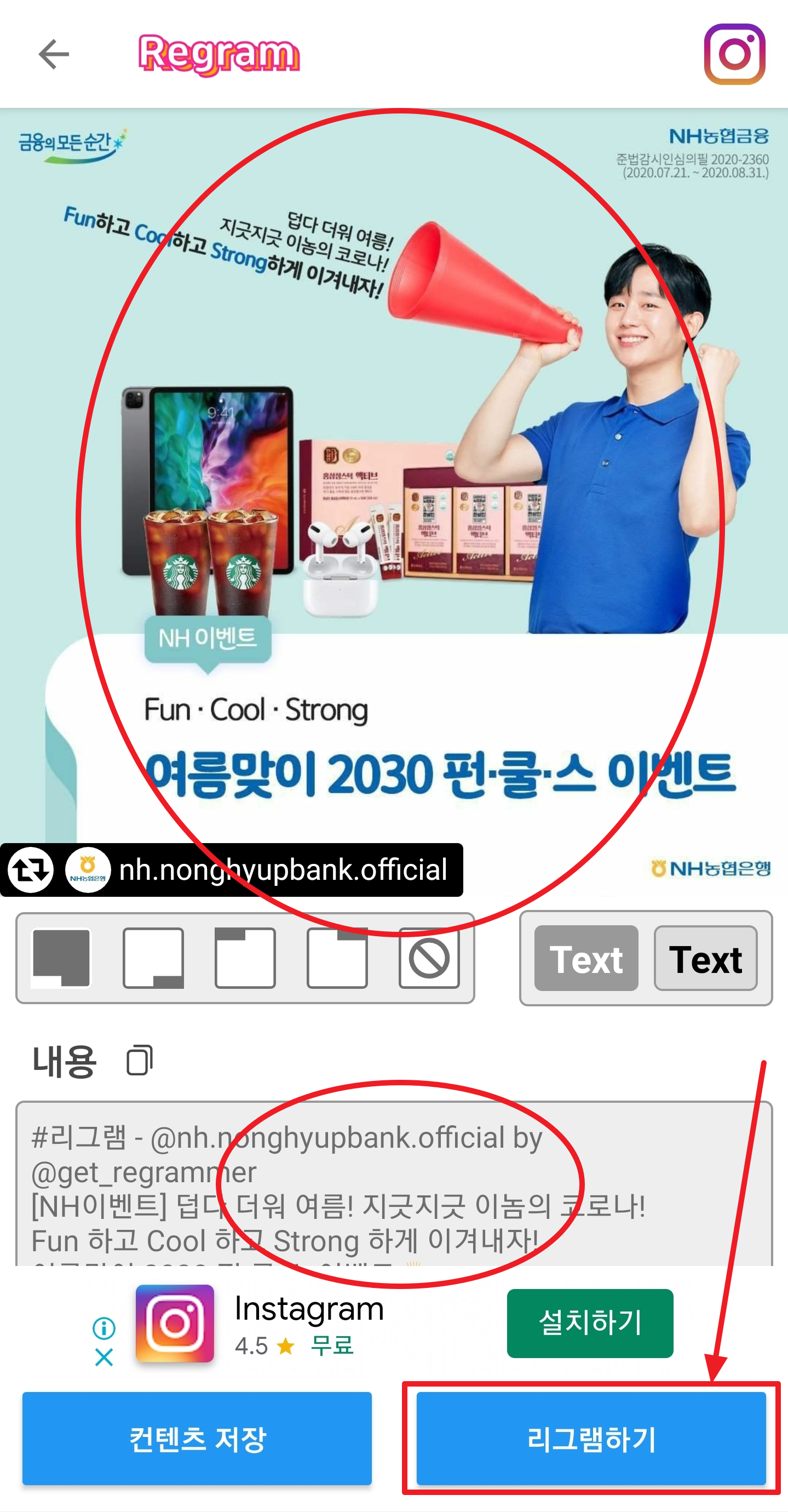 다른 메뉴들은 별로 사용할 필요가 없어서 바로 [리그램하기] 버튼을 눌러줍니다.
