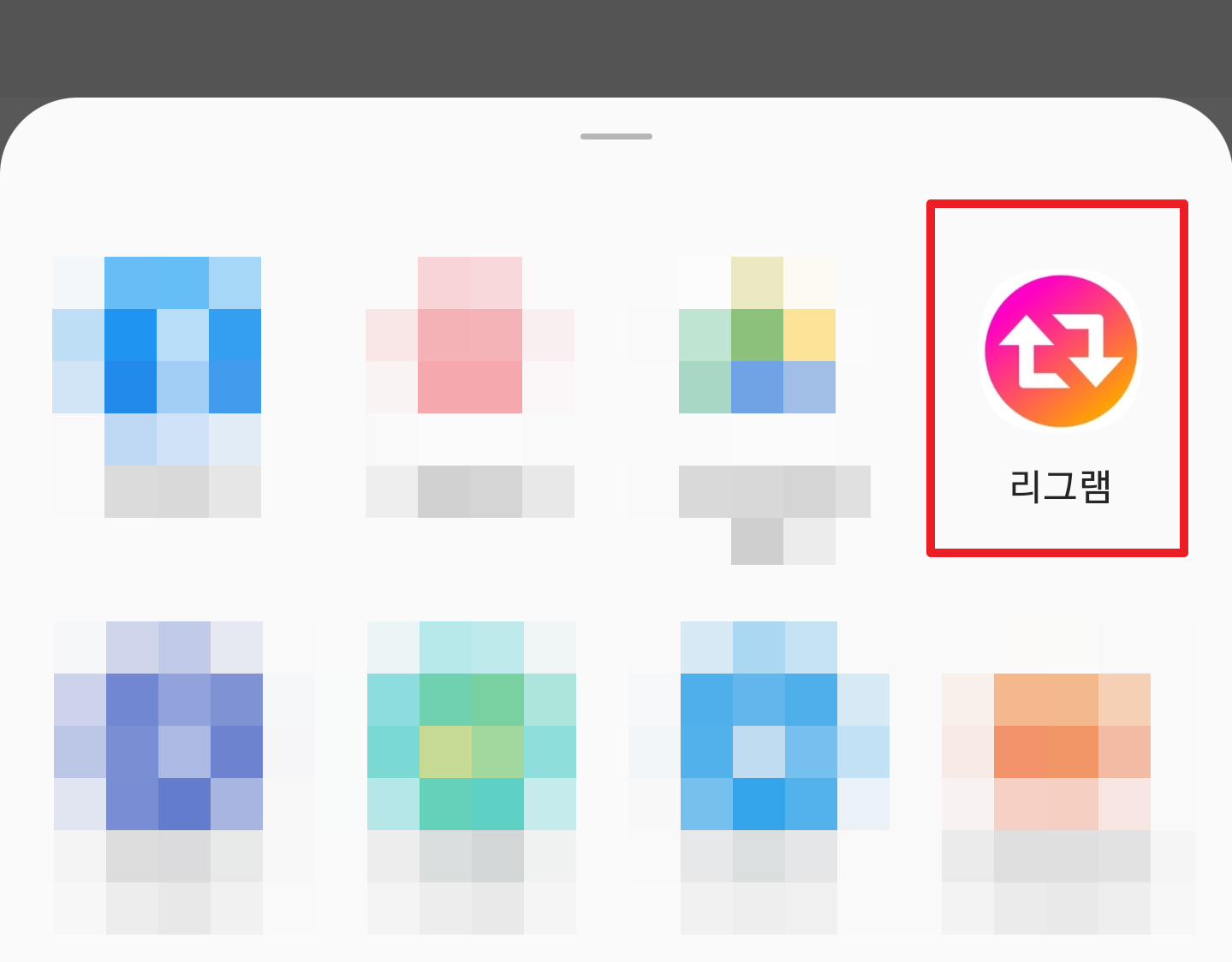 공유하기 버튼을 눌렀을 때 나타나는 여러가지 앱들 중 조금 전에 설치한 [리그램] 앱을 선택하면, 리그램 앱이 실행되면서 방금 공유하기를 눌렀던 인스타그램의 컨텐츠 1개가 리그램 앱에 들어온 것을 볼 수 있습니다.