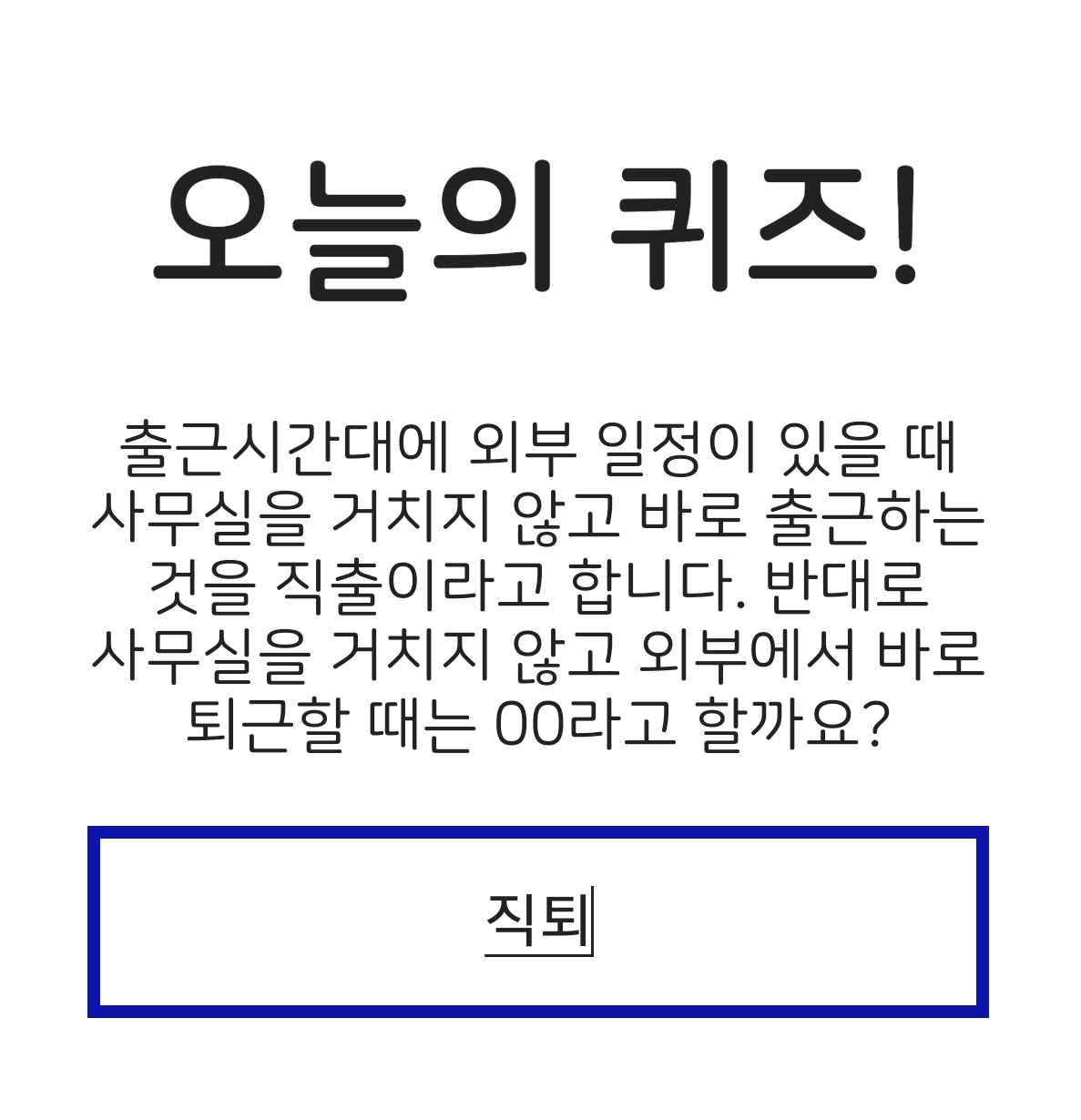 [문제] 출근시간대에 외부 일정이 있을 때 사무실을 거치지 않고 바로 출근하는 것을 직출이라고 합니다. 반대로 사무실을 거치지 않고 외부에서 바로 퇴근할 때는 OO라고 할까요?