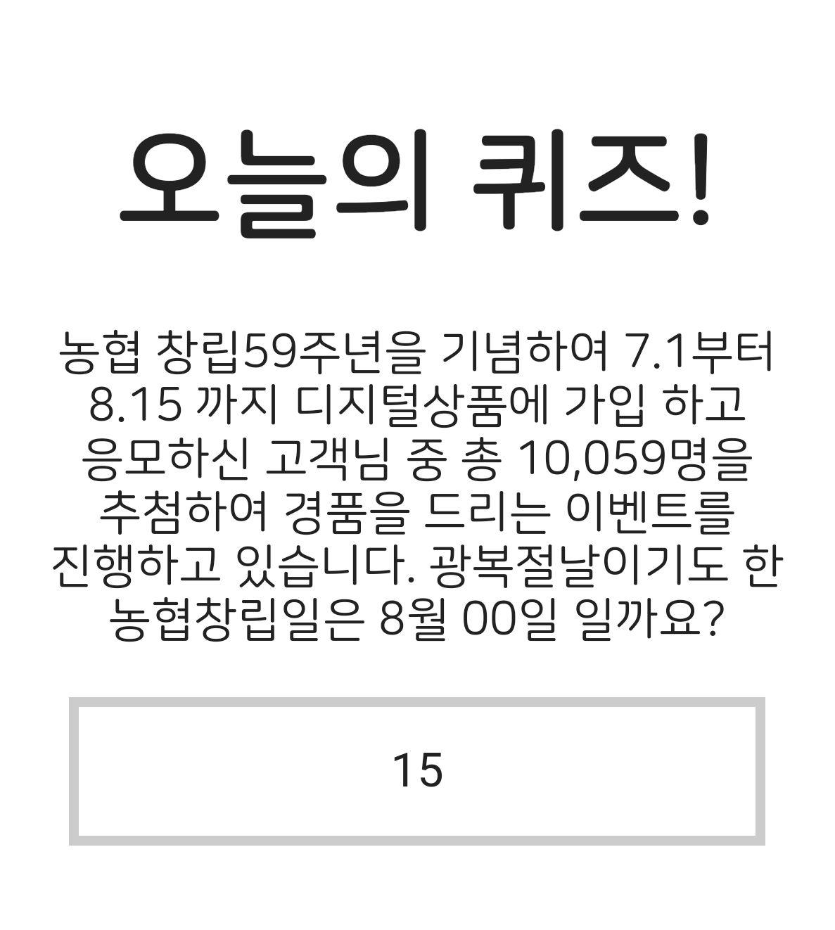 [문제] 농협 창립 59주년을 기념하여 7.1부터 8.15까지 디지털상품에 가입하고 응모하신 고객님 중 총 10,059명을 추첨하여 경품을 드리는 이벤트를 진행하고 있습니다. 광봉적날이기도 한 농협창립일은 8월 00일 일까요?