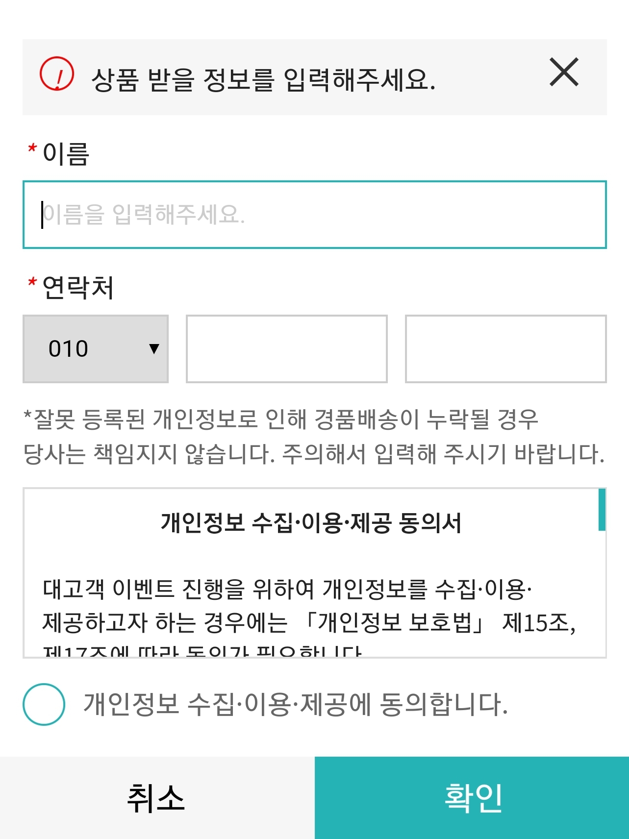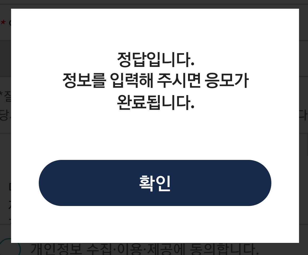 이렇게 정답을 입력하고 나면 정답 팝업과 함께 응모자 인적사항을 적을 수 있는 화면이 뜹니다. 이름과 연락처를 잘 적어준 후 확인을 누르면 응모 완료!