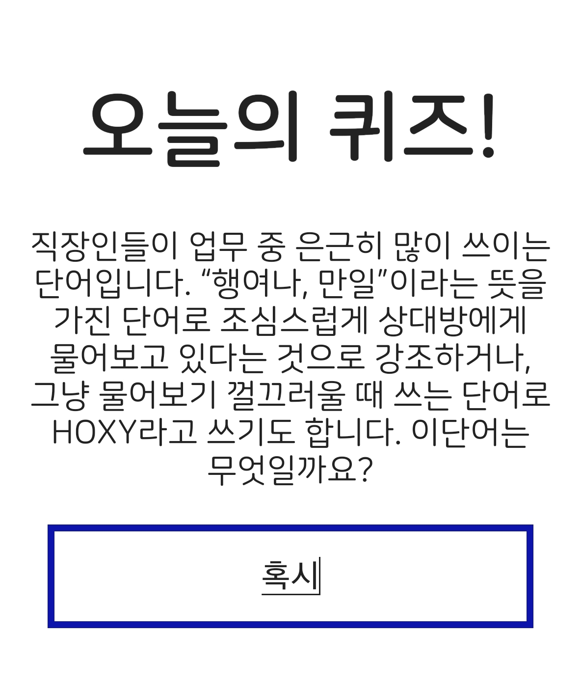 "행여나, 만일"이라는 뜻을 가진 단어로 조심스럽게 상대방에게 물어보고 있다는 것으로 강조하거나, 그냥 물어보기 껄끄러울 때 쓰는 단어로 HOXY라고 쓰기도 합니다. 이 단어는 무엇을까요?