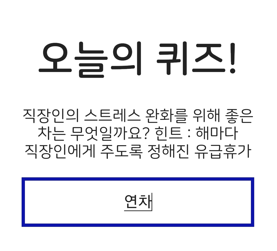 [문제] 직장인의 스트레스 완화를 위해 좋은 차는 무엇일까요? 힌트 : 해마다 직장인에게 주도록 정해진 유급휴가