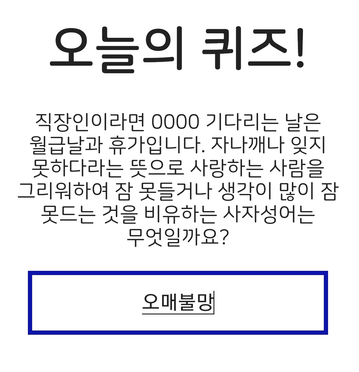 [문제] 직장인이라면 OOOO 기다리는 날은 월급날과 휴가입니다. 자나깨나 잊지 못하다라는 뜻으로 사랑하는 사람을 그리워하여 잠 못들거나 생각이 많아 잠 못드는 것을 비유하는 사자성어는 무엇일까요?