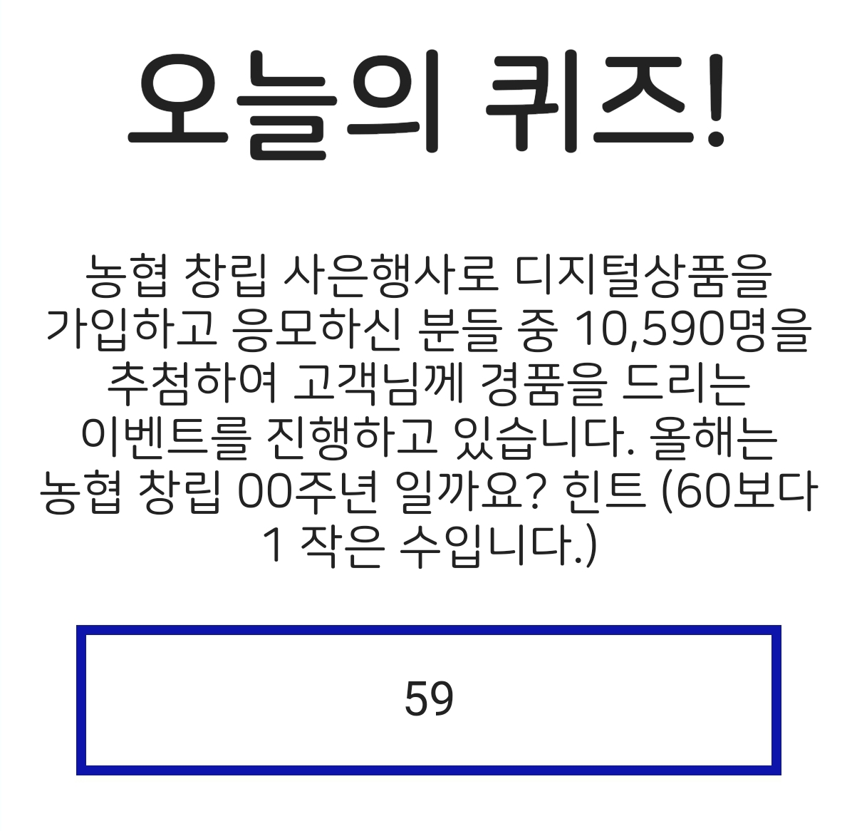 [문제] 농협 창립 사은행사로 디지털상품을 가입하고 응모하신 분들 중 10,590명을 추첨하여 고객님께 경품을 드리는 이벤트를 진행하고 있습니다. 올해는 농협 창립 00주년 일까요? 힌트 (60보다 1 작은 수 입니다.)