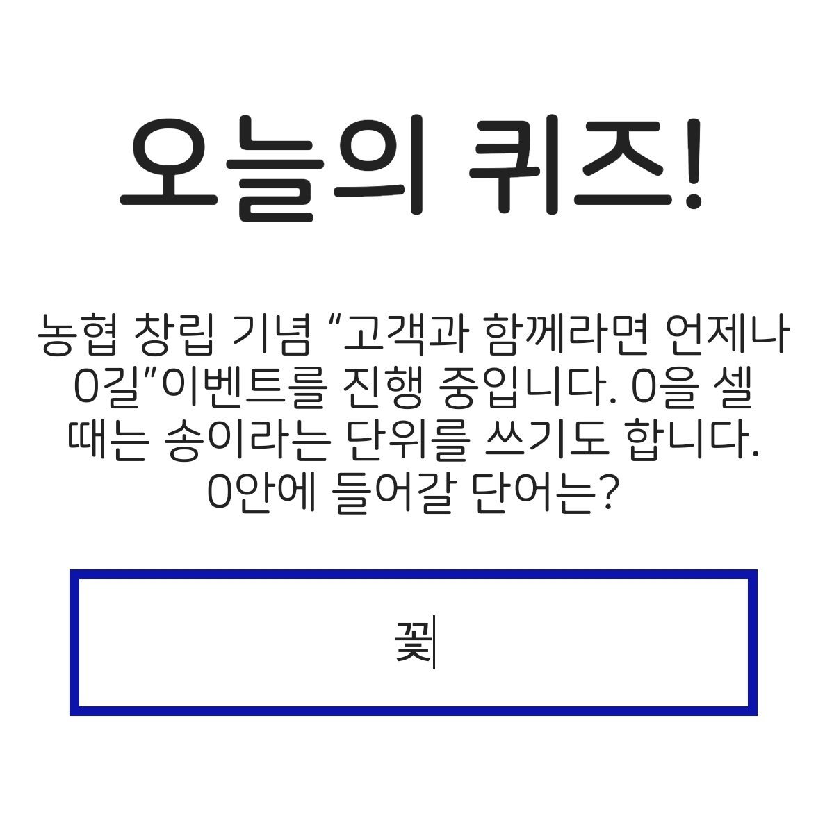 [문제] 농협 창립 기념 "고객과 함께라면 언제나 0길" 이벤트를 진행 중입니다. 0을 셀 때는 송이라는 단위를 쓰기도 합니다. 0 안에 들어갈 단어는?