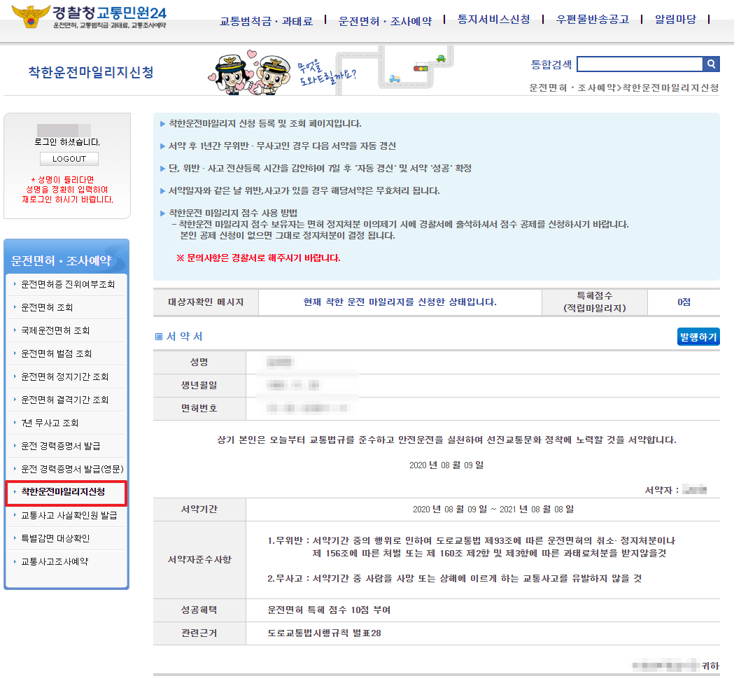 서약 후 1년간 무위반, 무사고일 경우 다음 1년의 서약은 자동으로 갱신되기 때문에 별 이상 없이 차량을 운행했다면 갱신을 위해 매번 신청하지 않아도 무방합니다.