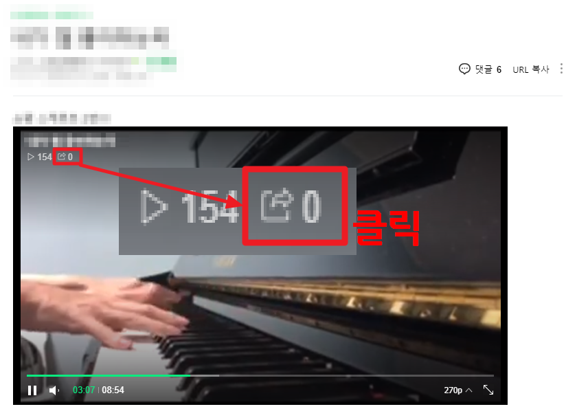 네이버 카페나 블로그의 각 동영상에 마우스를 올리면, 왼쪽 상단에 공유 버튼이 나타납니다.