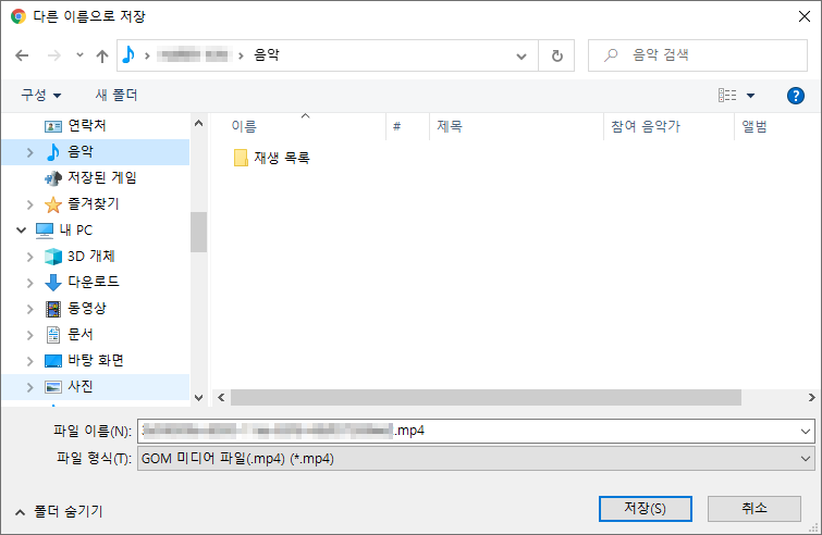 파일을 저장할 위치를 묻는 화면이 나타나면, 동영상을 저장할 적절한 위치를 선택한 후, 저장 버튼을 누르면 됩니다.