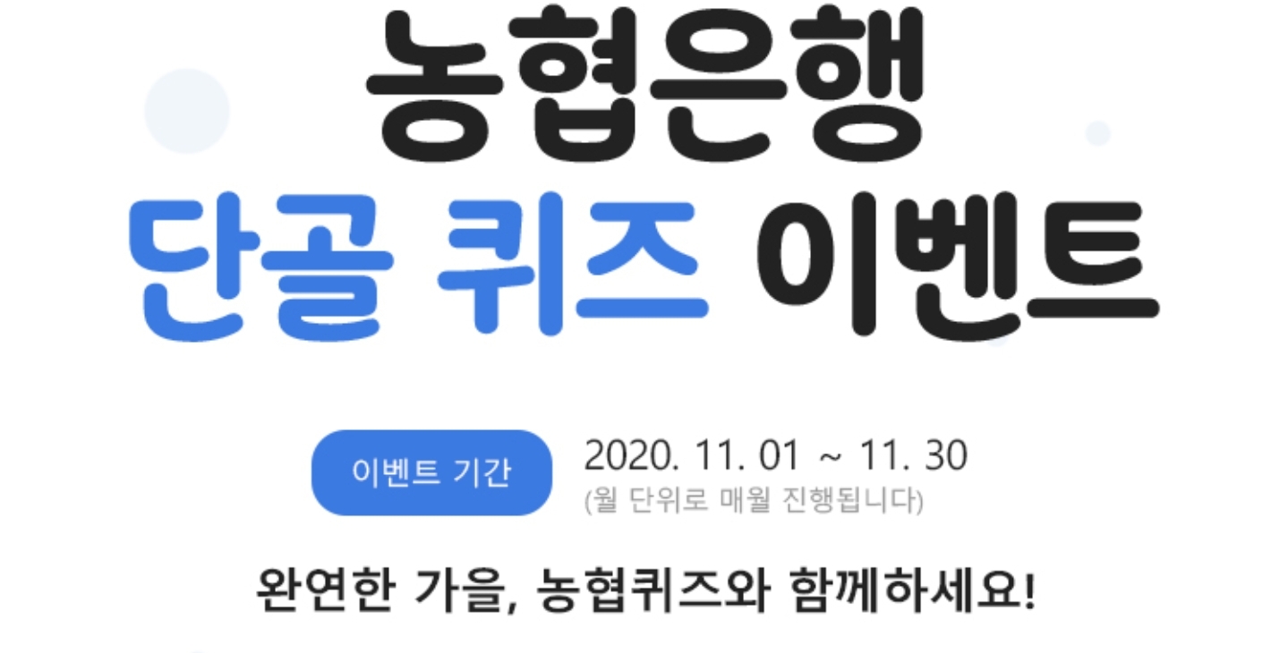 올원뱅크 농협은행 11월 단골퀴즈 이벤트는 많이 참여할수록 당첨 확률이 올라가고, 또 누구나 제한없이 참여가 가능하기 때문에 이벤트가 끝나는 11월 30일까지 매일매일 꼭 풀어보시길 바랄게요!