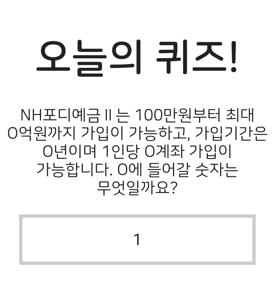 [문제] NH포디예금Ⅱ는 100만원부터 최대 O억원까지 가입이 가능하고, 가입기간은 O년이며 1인당 O계좌 가입이 가능합니다. O에 들어갈 숫자는 무엇일까요?