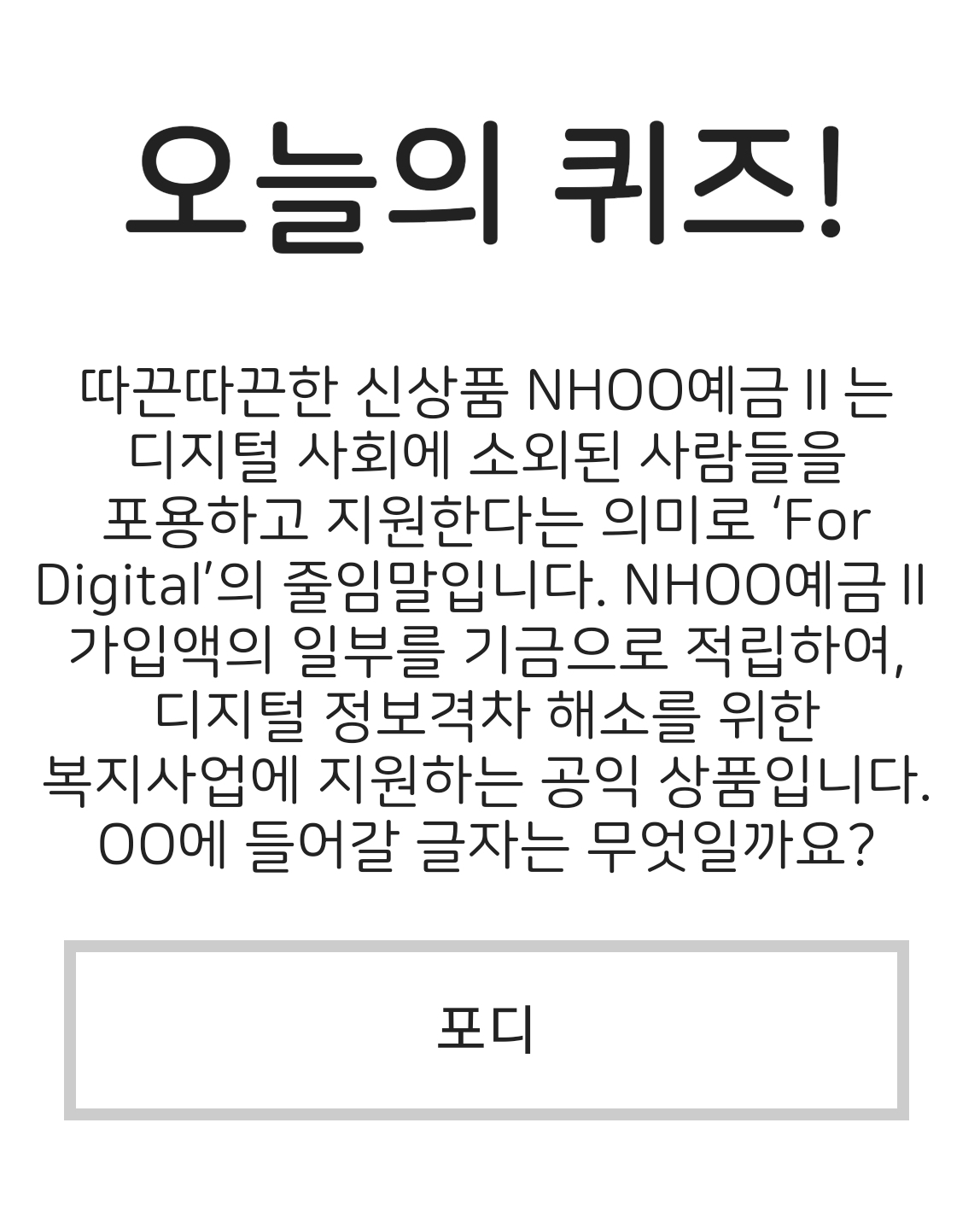 [문제] 따끈따끈한 신상품 NHOO예금Ⅱ는 디지털 사회에 소외된 사람들을 포용하고 지원한다는 의미로 'For Digital'의 줄임말입니다. NHOO예금Ⅱ 가입액의 일부를 기금으로 적립하여, 디지털 정보격차 해소를 위한 복지사업에 지원하는 공익 상품입니다. OO에 들어갈 글자는 무엇일까요?