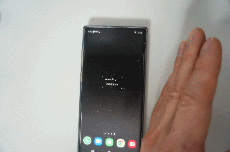 손으로 밀어서 캡쳐하는 방법을 이해하기 쉽게 GIF로 만들어봤는데요. 속도를 너무 빠르게 해서 손 날이 날아다니지만 실제로 저 속도보다 더 느리게 해도 캡쳐가 가능합니다. 주의할 점은, 손 날의 전체적인 면이 화면 전체에 닿게 하면서 쓸어주어야 제대로 캡쳐가 가능하니 이 점은 주의해주세요.