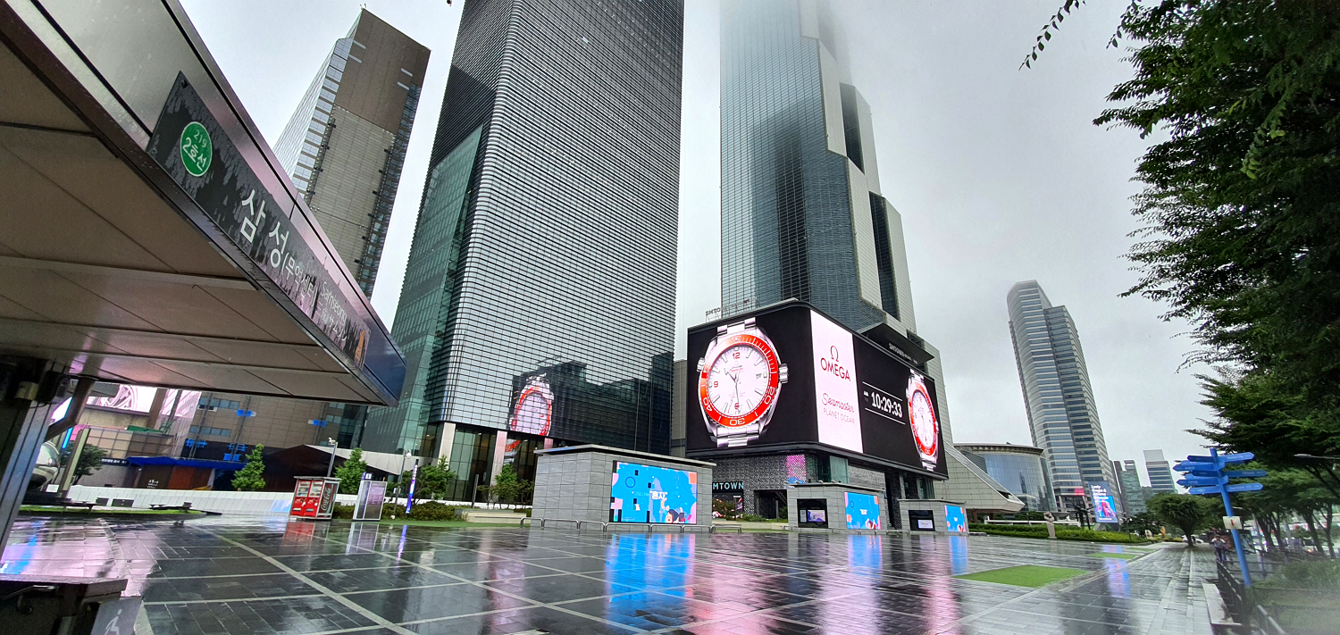80x20미터 크기의 이 화면은 브랜드 광고, K-pop 영상, 최근에는 디지털 아트 설치를 위한 인기있는 사이니지로 유명해졌습니다.