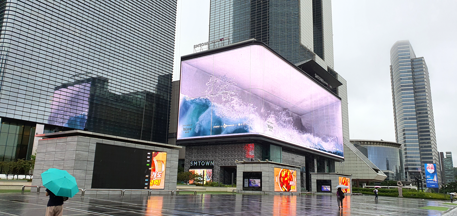 대한민국 최대 LED 디지털 사이니지인 SMTown COEX 빌딩의 LED 파사드에 거대한 파도가 나타났습니다. 엄청난 착시 현상 때문에 파도가 출렁거리면서 대형 수조처럼 보이기도 합니다.