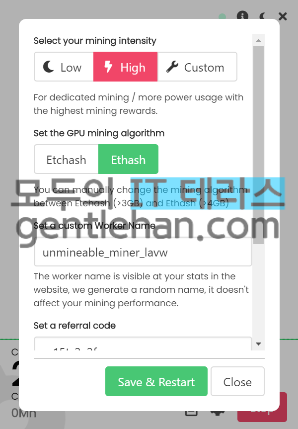 오른쪽 아래의 Worker 항목은 채굴 프로그램을 여러 대의 PC에 설치했을 때, 각 PC의 속도가 어떻게 나오고 있는지 모니터링하는 용도로 사용되는데 2개 이상의 PC에서 채굴 프로그램을 실행하시는 경우, 유용한 기능입니다.