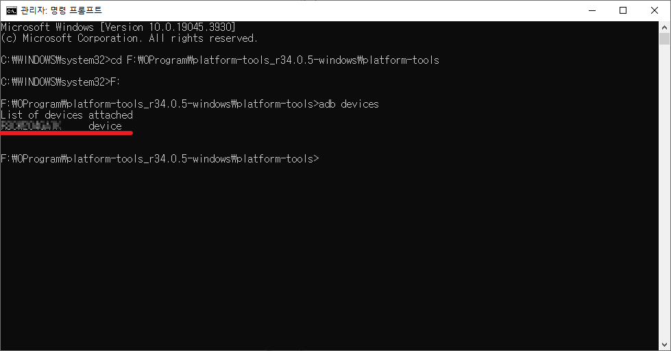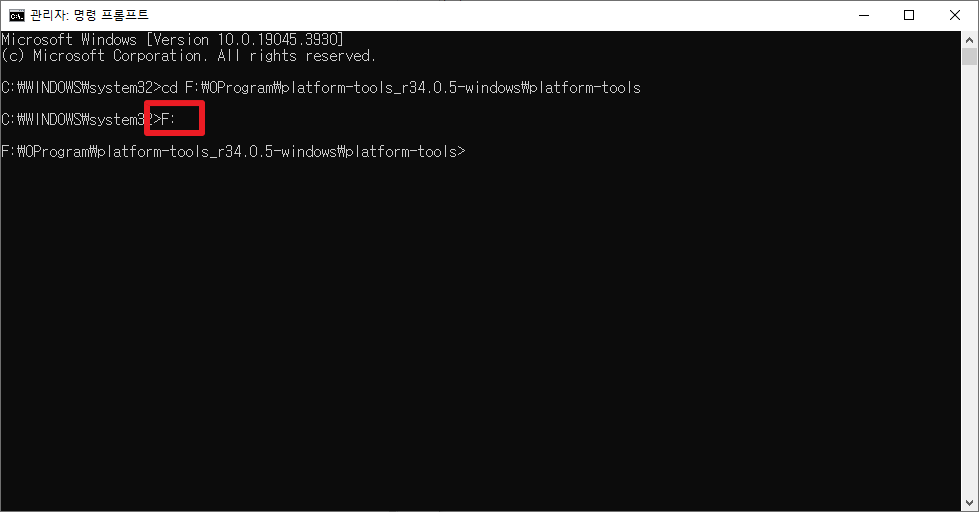 엔터를 치고 아까 붙여넣은 폴더 주소의 드라이브 이름을 한번 더 쳐주면 adb 폴더로 경로가 변경됬다고 보여줍니다.