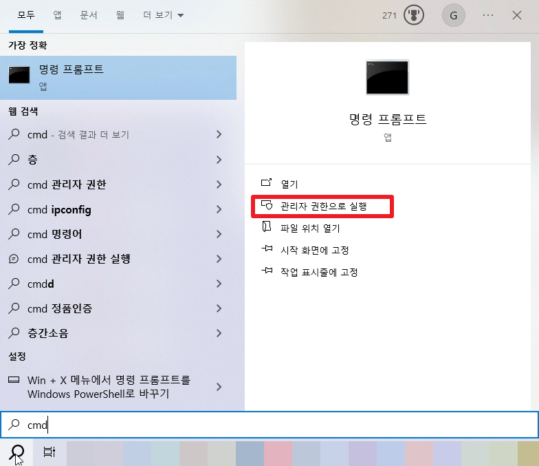 그 다음, 명령프롬프트를 열어야 하는데, 윈도우 작업표시줄에 검색으로 [cmd]를 쳐서 [관리자 권한으로 실행] 해주세요.