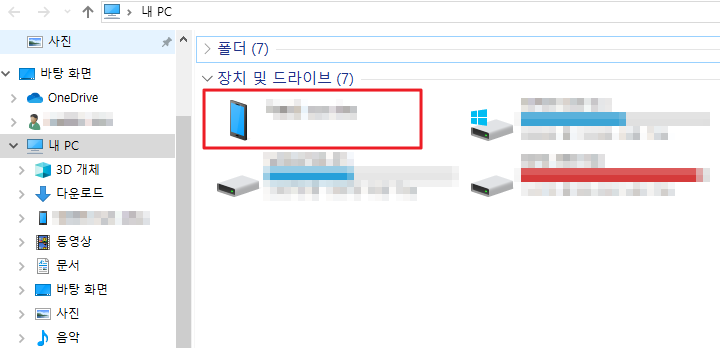 핸드폰을 PC와 연결을 해주는데 이 때, 충전만 되는 싸구려 핸드폰 케이블말고 파일전송도 가능한 케이블을 써야 adb에 나오는데 바로 확인할 수 있는 방법은 아래와 같이 윈도우탐색기에 PC쪽으로 핸드폰이 잡히면 일단 OK!