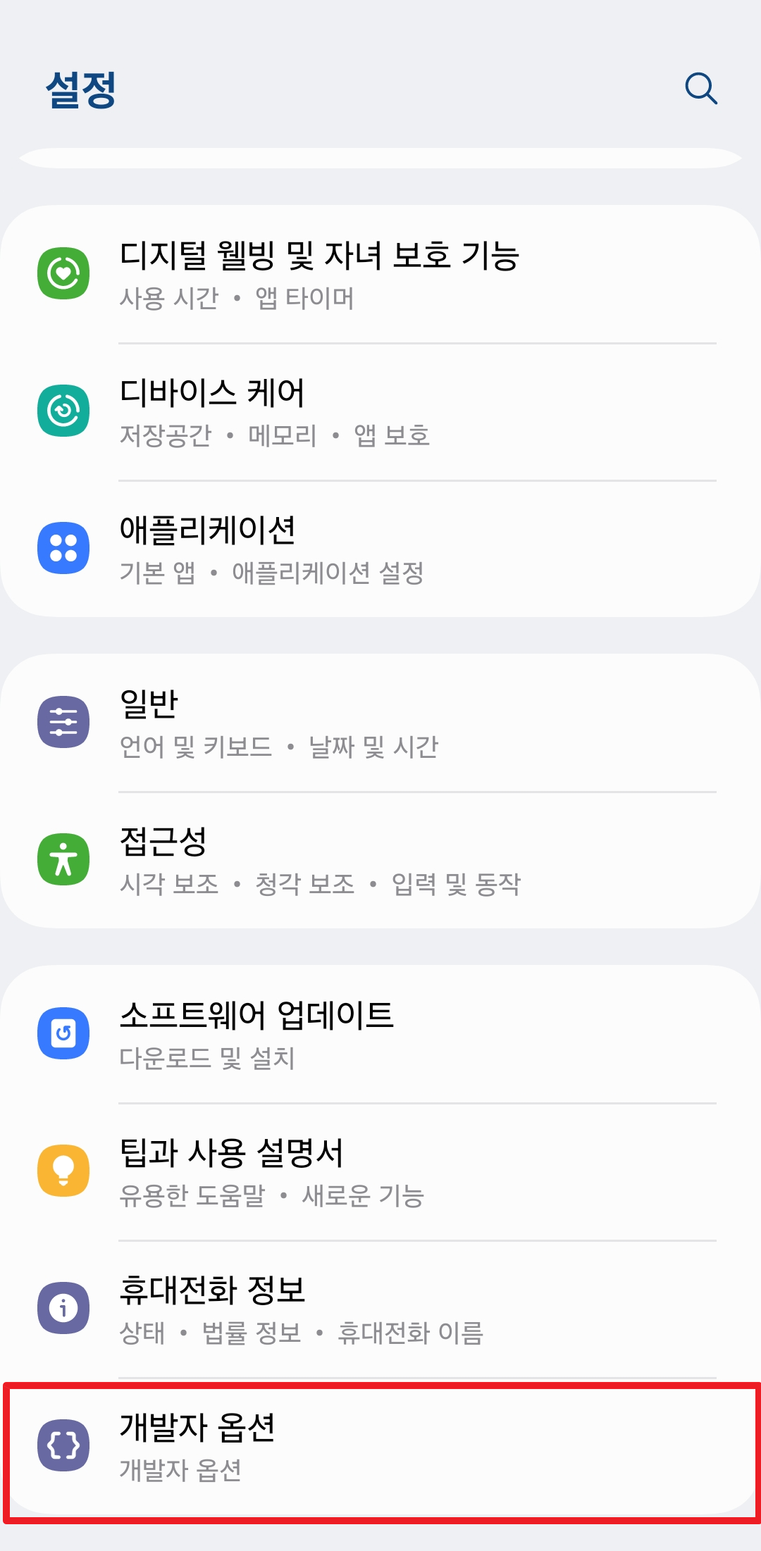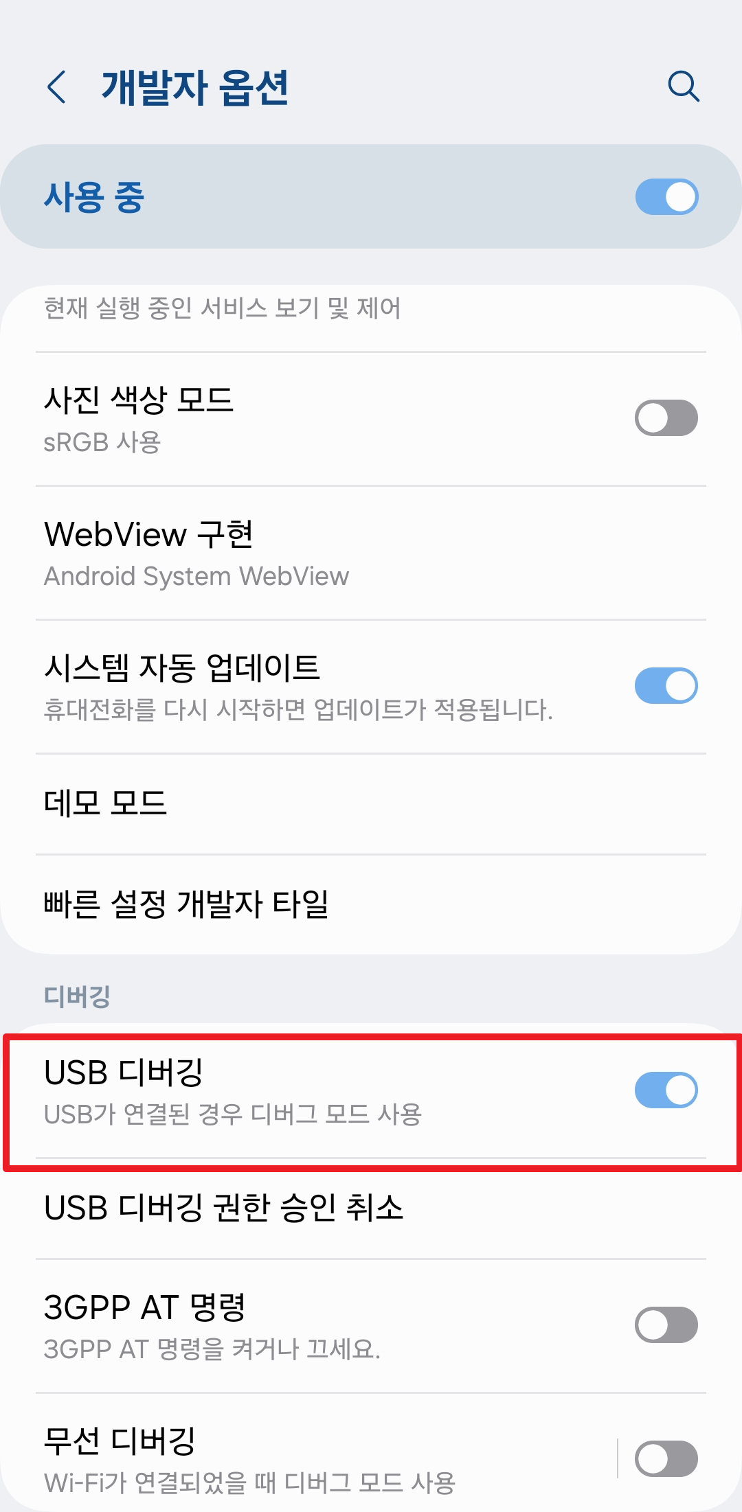 그럼 아래처럼 [개발자 옵션]이 활성화되는데, 거기로 들어가서 [USB 디버깅]을 켜줍니다.