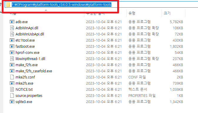이제 아까 adb 압축파일을 푼 폴더로 가서 폴더 주소를 Ctrl + C로 복사해줍니당.