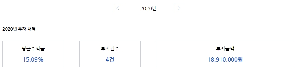 2019년 9월부터 500만원으로 시작한 투자가 올해 2000만원까지 투자금을 늘려 총 7건의 투자를 진행하였고, 올해는 15.09%의 평균 수익률을 보게 되었습니다.