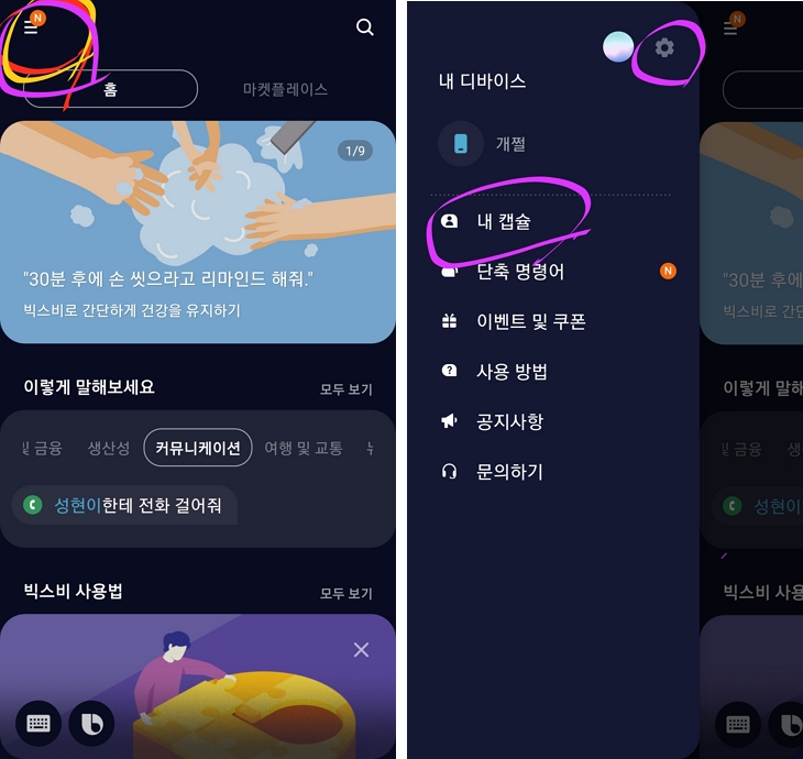 스마트폰 홈 화면에서 홈 화면을 오른쪽으로 슬라이드하면 빅스비 홈 화면이 나타나는데 이 화면에서 왼쪽 위 3개의 줄선을 터치하면, 1) '내 캡슐' 메뉴와 2) 톱니모양의 '설정' 아이콘이 보입니다.