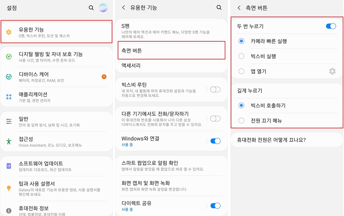 또한, 가장 중요한 것은 빅스비 버튼의 사용을 변경할 수도 있습니다. 이 설정값은 빅스비 홈의 '설정'이 아닌 휴대폰 자체의 설정 메뉴로 진입 후, '설정 > 유용한 기능 > 측면 버튼' 메뉴로 진입해서 버튼을 2번 누를 때 어떤 앱을 켤지 정할 수 있습니다.