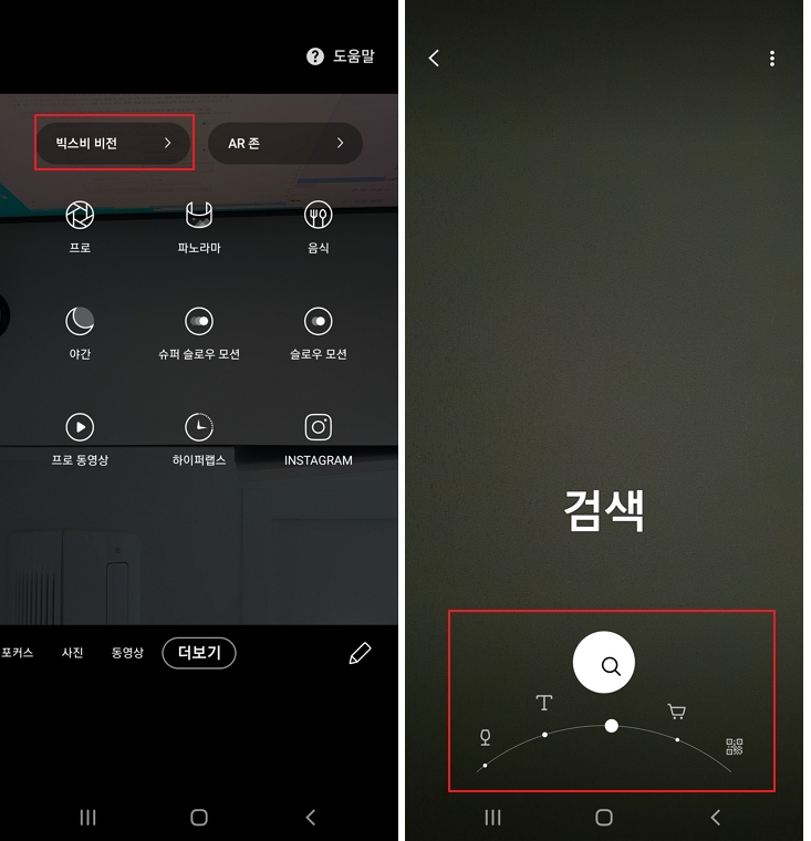 빅스비 비전은 머신 러닝과 DB 파트너십을 통해 카메라앱을 더 유용하게 만들어주는 기능입니다. 와인, 번역, 검색, 쇼핑, QR코드와 같이 여러가지를 인식할 수 있는데 카메라 앱에서 [더보기] 메뉴의 '빅스비 비전' 버튼을 누르면 원하는 인식 방법을 선택할 수 있습니다.